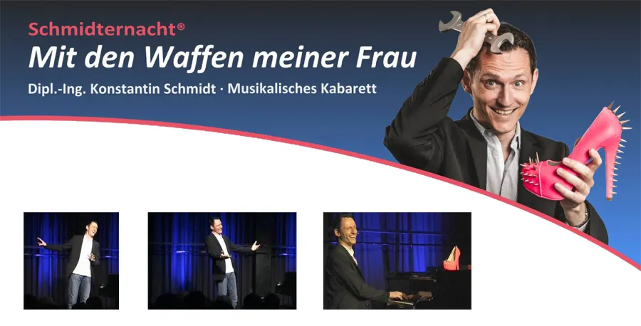 Wenn Konstantin Schmidt auf die Bühne tritt, wird es Schmidternacht: harmonisch, heiter, hintergründig. Ein Diplom-Ingenieur, seine Ehefrau, sein Vorgesetzter, eine Controllerin, ein Musiker und ein Schauspieler