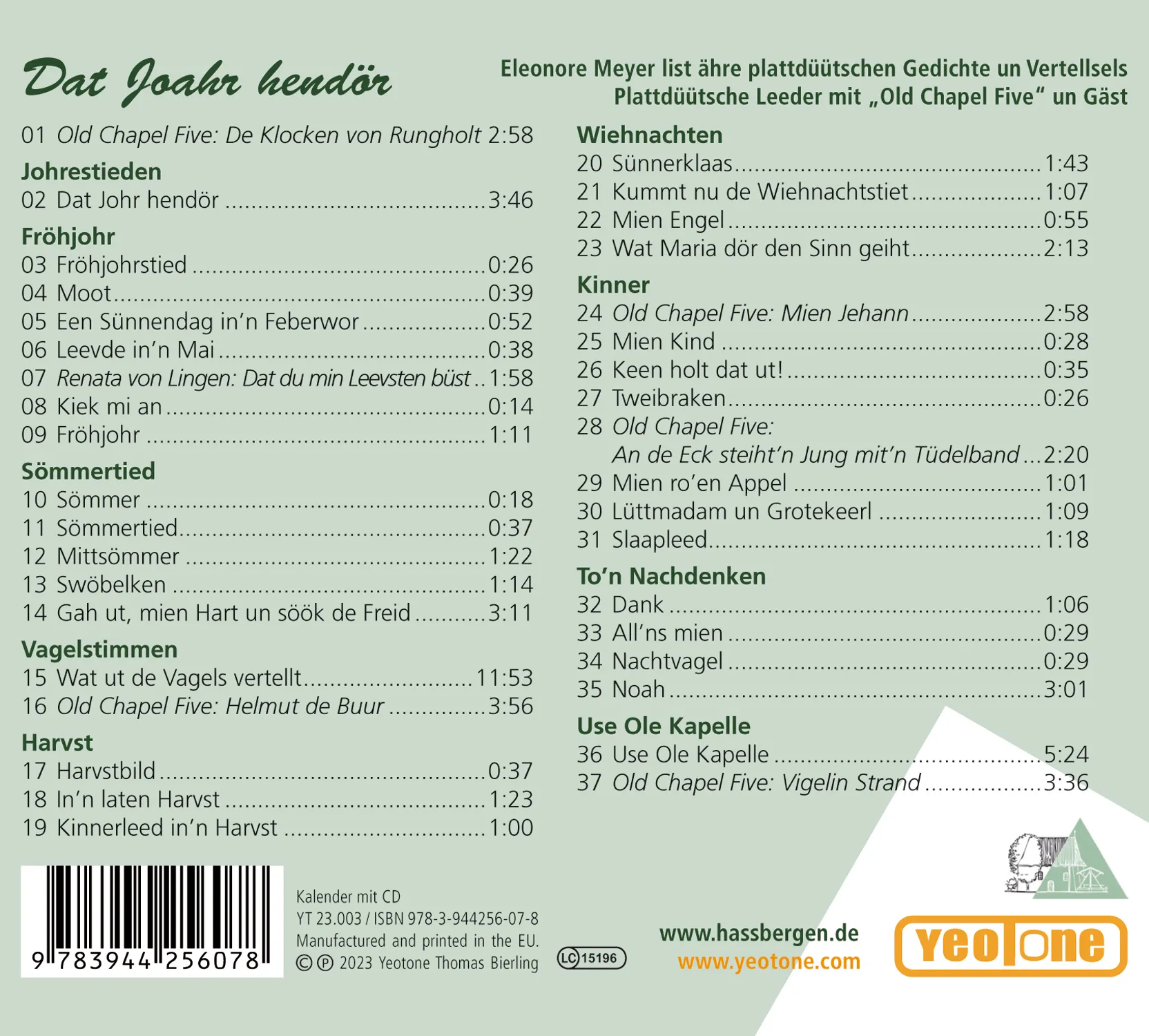 „Dat Joahr hendör“: Ein immerwährender plattdeutscher Kalender und CD mit Bildern und Gedichten. Gemalt, geschrieben und eingesprochen von Eleonore Meyer. Die Pflege der plattdeutschen Sprache ist auch für den Heimatverein Haßbergen eine wichtige Verpflichtung. Umso mehr freuen wir uns, ein neues Projekt dazu vorstellen zu können: „Dat Joahr hendör. De Plattdüütsche Kalenner, de för jümmer gellt.“ Nach einem plattdeutschen Quartett und einem Memory-Spiel ist dies das dritte Projekt gemeinsam mit der Haßbergener Heimatdichterin Eleonore Meyer, die sich seit Jahrzehnten diesem Thema in ihren Texten und Gedichten verschrieben hat. In der Alten Kapelle und an anderen Orten ist sie auch im Alter von inzwischen 85 Jahren mit Lesungen und Sprachkursen tätig. Die Idee eines plattdeutschen Jahreskalenders stand schon länger im Raum und konnte nun realisiert werden. Er orientiert sich an ihrem Gedicht „Dat Joahr hendör“, das in zwölf Strophen den Lauf des Jahres beschreibt. Und da Eleonore Meyer auch malt, hat sie den Kalender mit zwölf Bildern selbst illustriert. Doch damit nicht genug – wer Eleonore Meyer einmal lesen gehört hat, ist begeistert von der Klarheit und Ausdrucksstärke ihres Vortrages. Und so kam es zu der Idee, den Kalender um eine CD zu ergänzen, auf der sie insgesamt 31 Texte und Gedichte vorträgt, die auch im Booklet der CD abgedruckt sind. Die Gedichte beschäftigen sich mit den Jahreszeiten und der Natur, aber auch mit den lustigen, nachdenklichen oder auch traurigen Momenten des Lebens. Doch damit noch nicht genug. Als Ergänzung zum gesprochenen Wort finden sich noch Aufnahmen von sechs plattdeutschen Liedern, eingespielt von Musikern der Haßbergener Band „Old Chapel Five“ und Gästen.