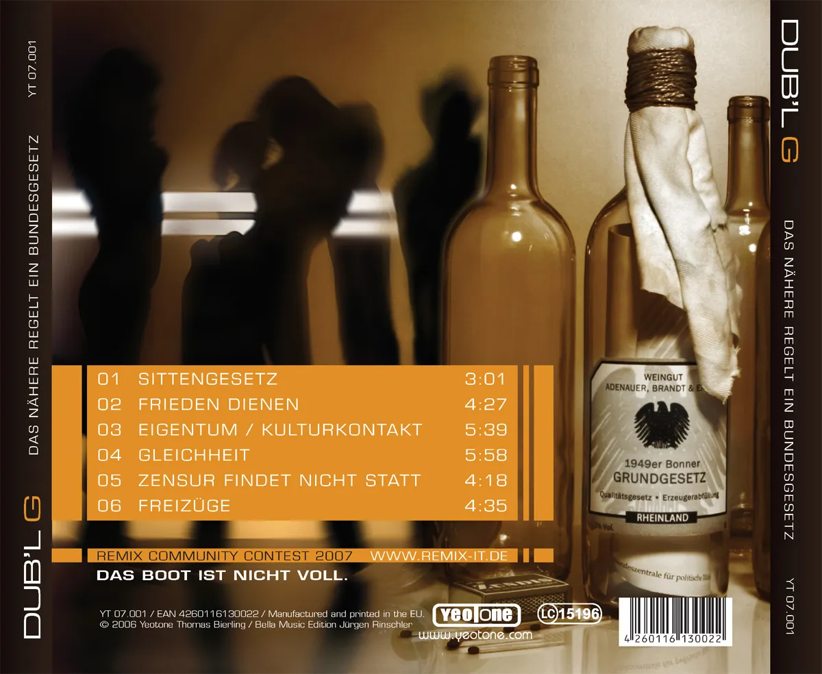 Darf man das Grundgesetz der Bundesrepublik Deutschland als Rohmaterial für musikalische Experimente deklarieren und in Disco-taugliche Sound-Texturen übersetzen? Darf man so frei sein, es in eine Pop-CD umzustricken? Verfassungsschützer werden schon von Berufs wegen Einspruch gegen das CD-Projekt „Dub’l G“ erheben. Aus ihrer Sicht gibt es einen guten Grund, dass in das wichtigste Regelwerk des Rechtsstaats eine Sperrvorrichtung gegen Veränderung eingebaut wurde. Die Erfahrung der NS-Zeit hat den Parlamentarischen Rat 1949 dazu bewogen, einer kreativen Umarbeitung den Riegel der 2/3-Mehrheit vorzuschieben. Dennoch sehen es Künstler, die für Internationalität, Interkulturalität und Toleranz eintreten, als ihre Aufgabe, die Gegenwarts-Tauglichkeit des Grundgesetzes immer wieder zu hinterfragen. Schließlich wäre es fatal, wenn das Denken in grundlegenden und radikalen Kategorien den neu erstarkenden Nationalkonservativen und Neo-Faschisten überlassen bliebe. Rechts von der Mitte wird derzeit intensiv an der Demotage speziell jener elementaren Artikel gearbeitet, die Minderheiten schützen und Privatsphäre und Individualität garantieren.