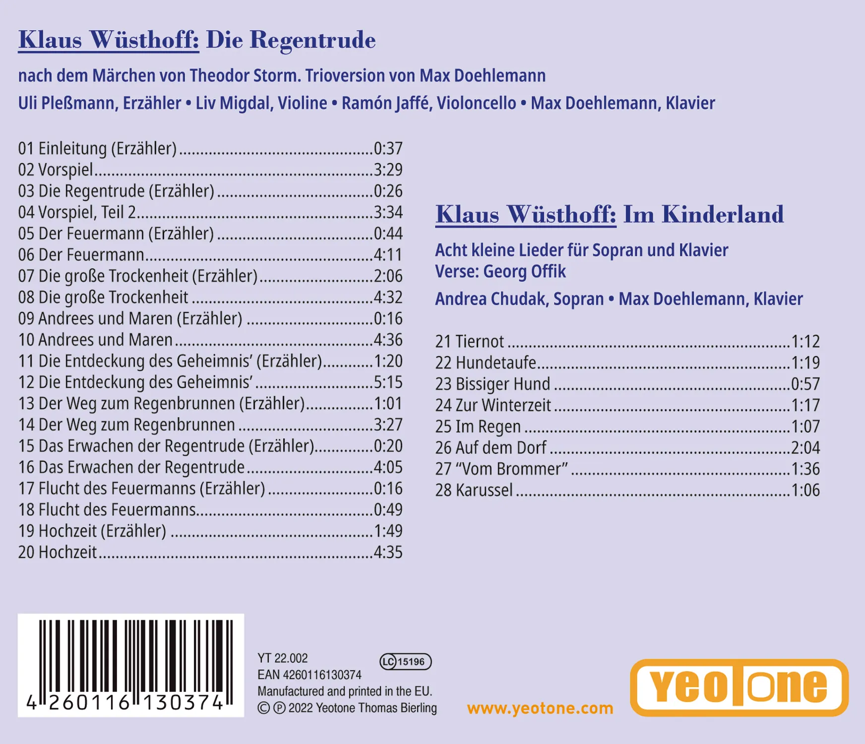 Am 1. Juli 2022 wäre Klaus Wüsthoff (1922 bis 2021) 100 Jahre alt geworden. Das ist der Anlass für eine Hommage an den großen und geistreichen Melodiker. Diese CD bringt zwei gehaltvolle Werke von Klaus Wüsthoff in Erstaufnahmen heraus: „Die Regentrude“ (Version für Klaviertrio und Erzähler) und „Im Kinderland“ (Fassung für Sopran und Klavier). Die CD richtet sich besonders an Kinder und Familien.