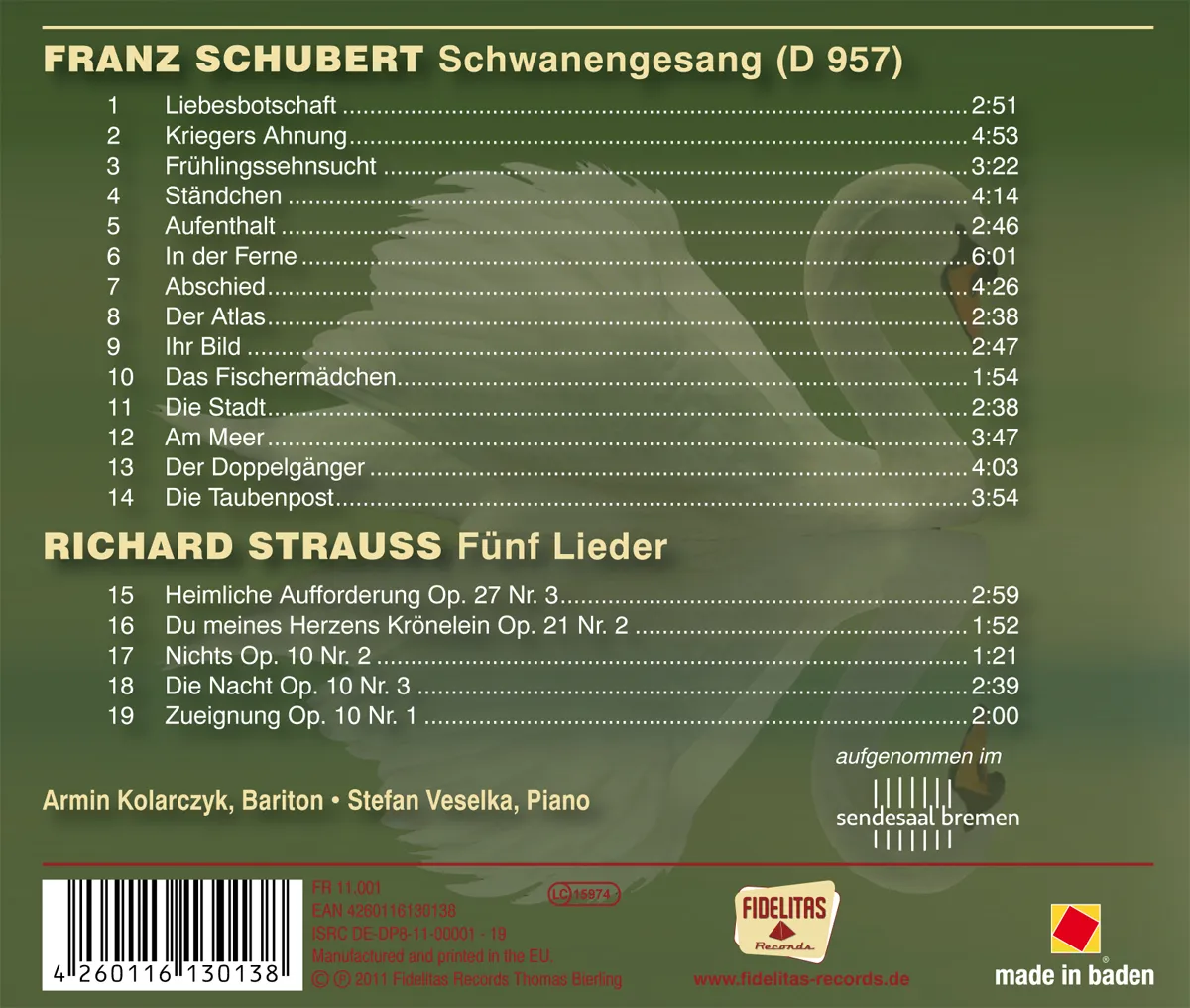 Ausgerechnet Schuberts Schwanengesang und Straussens Fünf Lieder! Dieses Repertoire gibt es auf dem Schallplattenmarkt mannigfach. Was ist der Reiz, noch eine Einspielung vorzulegen? Gibt es Neues, mehr noch: ist die Aufnahme eine Bereicherung, eine Entdeckung für das Publikum, für den Zuhörer? Das ist die grundlegende Frage – und die beantwortet der Bariton Armin Kolarczyk zusammen mit dem Pianisten Stefan Veselka in einer sehr persönlichen Deutung: Es gibt sie, die neue Sicht und die ist gleichermaßen sensibel, pulsierend und ausnehmend facettenreich. Ein Rezensent merkt an: „atemberaubend, bezaubernd … nur Kolarczyk live zu erleben, ist besser … zweifellos eine Bereicherung!“