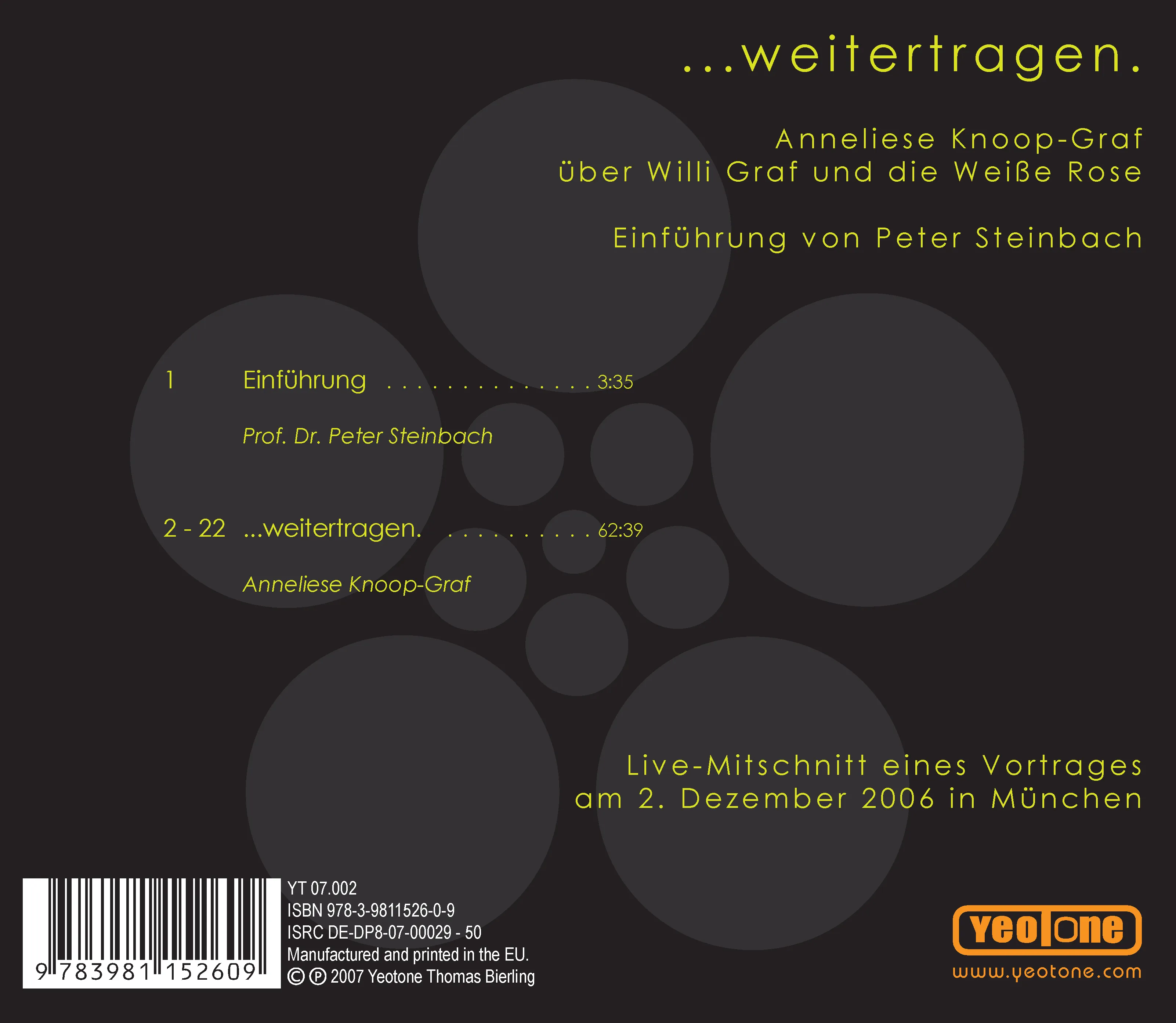 Die Serie „Yeotone Dokumente“ wird begonnen mit dem Live-Mitschnitt „…weitertragen.“, eines Vortrages von Anneliese Knoop-Graf.
